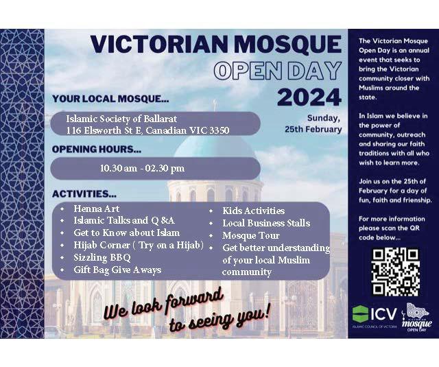 We are pleased to invite everyone in the Ballarat community and nearby to the Victorian Mosque Open Day at Ballarat Mosque located at 116 Elsworth Street East, Canadian.