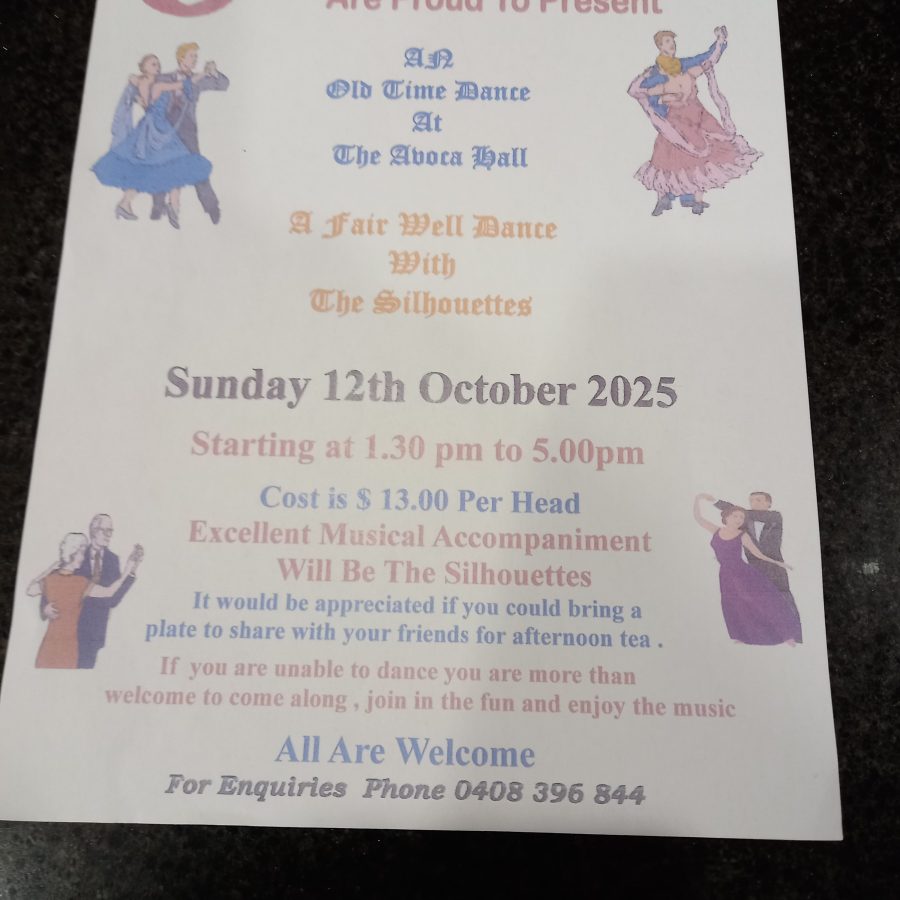 Old time dance on Sunday 12th October 2025 from 1.30pm to 5.00pm at The Avoca Town Hall, Rutherford Street, Avoca. Vic.