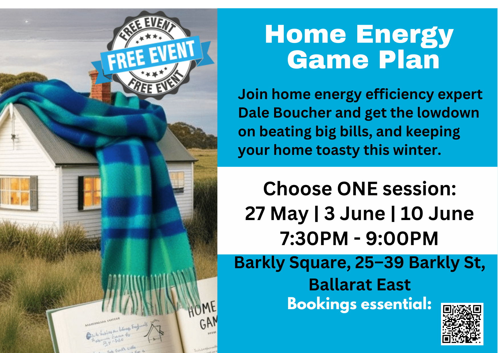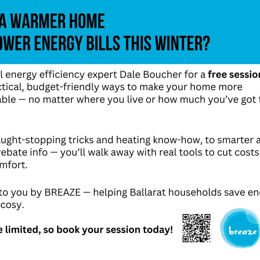 At this free session with local energy expert Dale Boucher, we’ll walk you through the steps to a cosier, cheaper-to-run home — starting with where you’re at, and where you’d like to be.