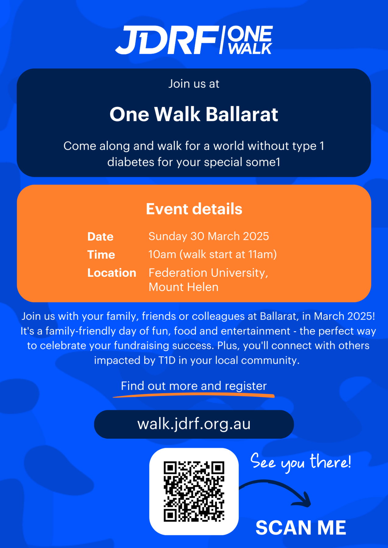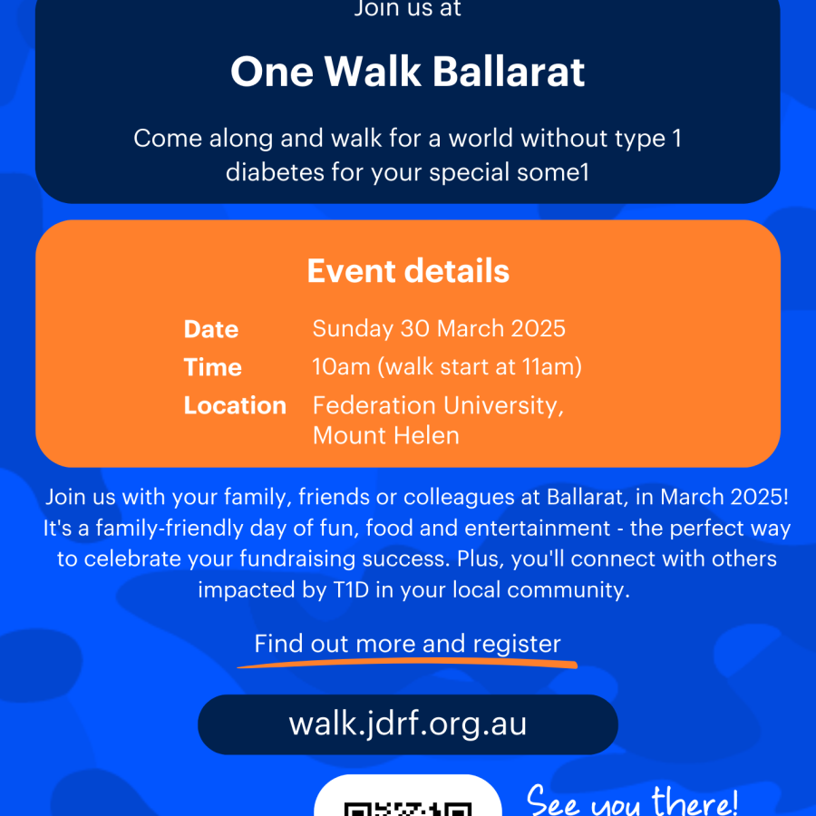JDRF / One Walk is to be held on Sunday March 30th, 2025 at 10am, walking starts at 11am, at Federation University, Mount Helen, Ballarat.