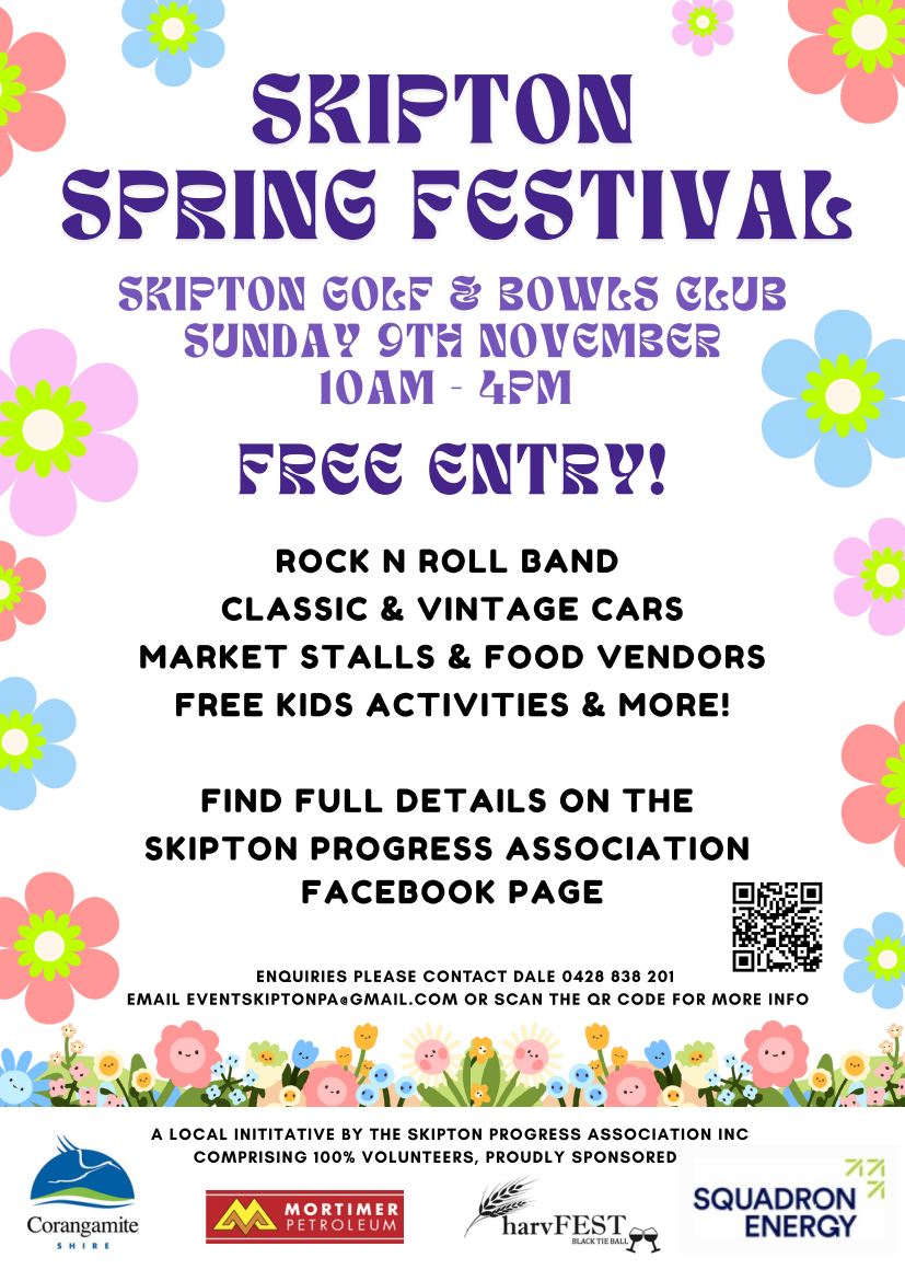Presented by the Skipton Progress Association with thanks to the support and generosity of our sponsors, and 100% run by volunteers, the 2025 Skipton Spring Festival will be a day for all ages.
