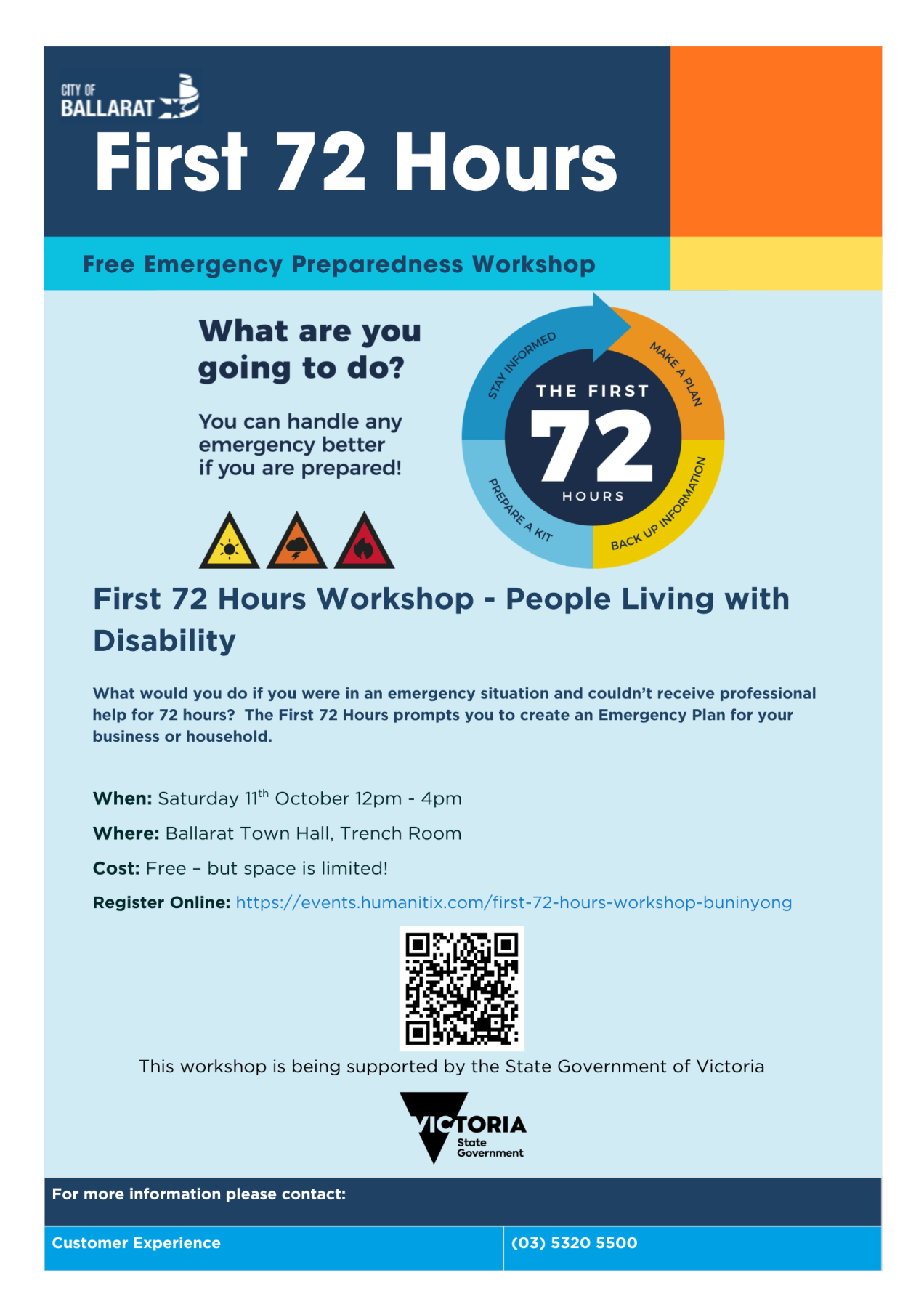 This weekend there are two First 72 Hours sessions running: Saturday 11 October’s session is 12pm-4pm, at Ballarat Town Hall, with a focus on People Living with Disability.