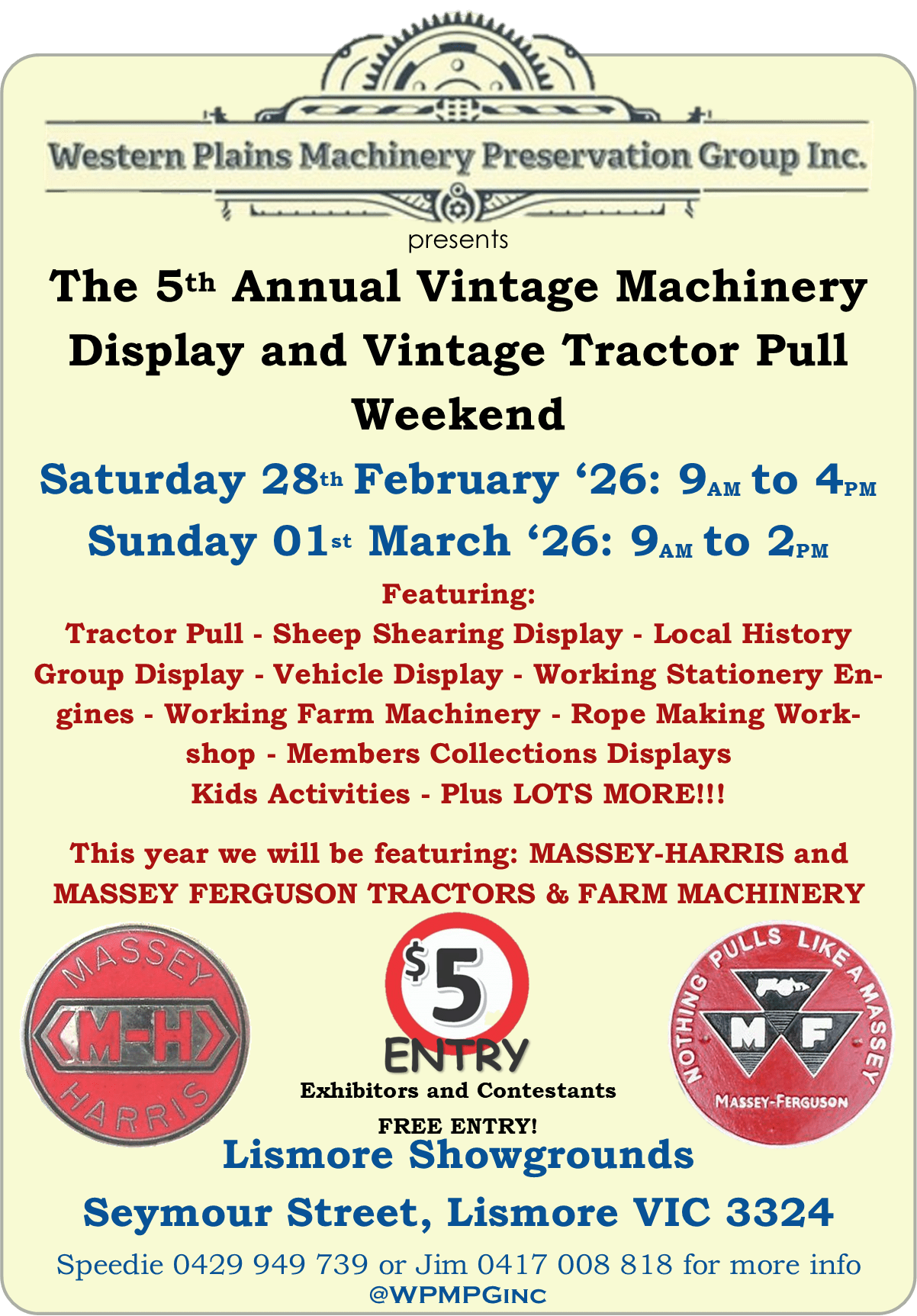 Western Plain Machinery Preservation Group Inc is hosting our 5th annual Vintage Machinery Display and Vintage Tractor Pull weekend.